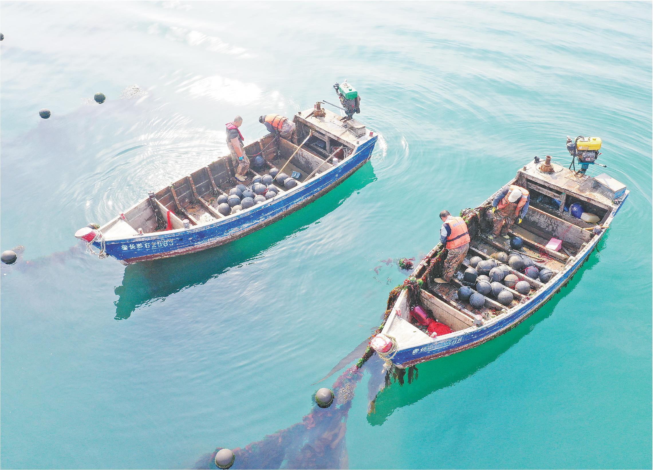 图为大钦岛渔民正在海上管护海带,为丰收作准备。