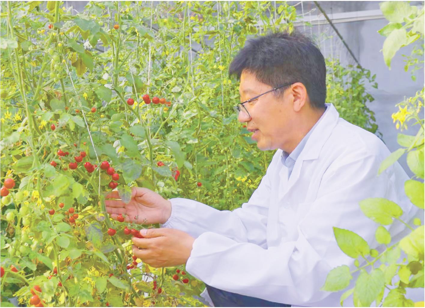 李传友教授正在察看培育番茄品种长势。(□资料图)