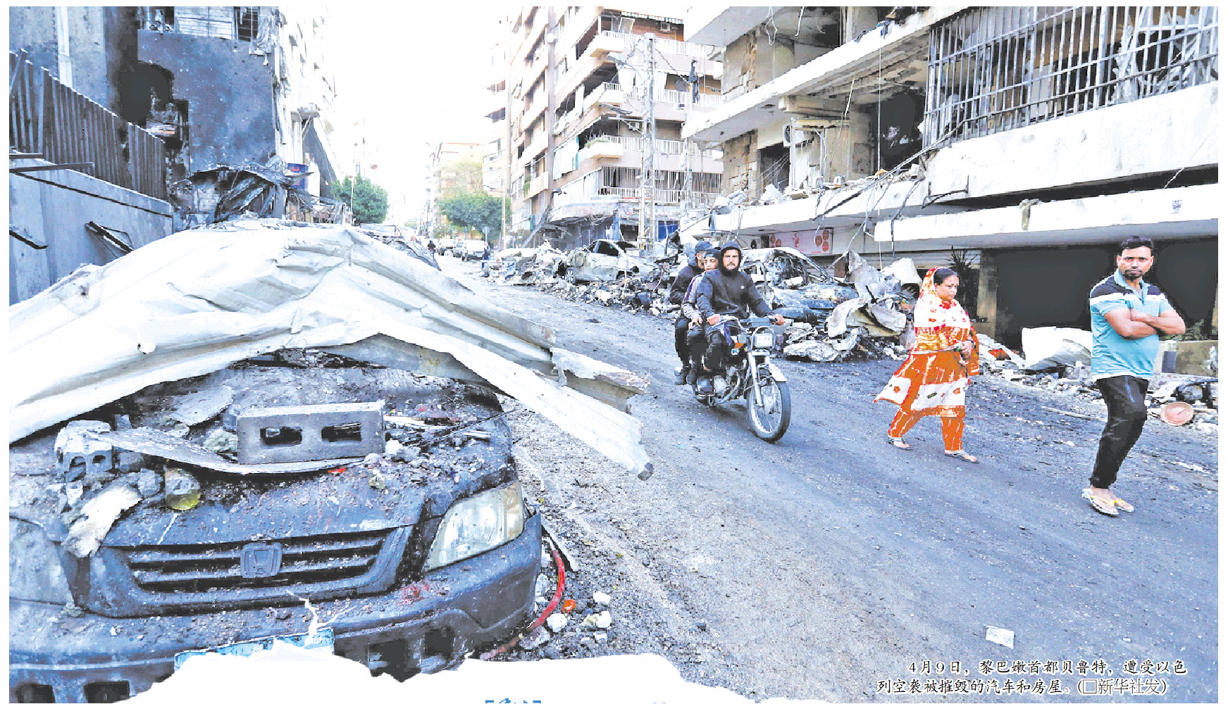 4月9日,黎巴嫩首都贝鲁特,遭受以色列空袭被摧毁的汽车和房屋。(□新华社发)
