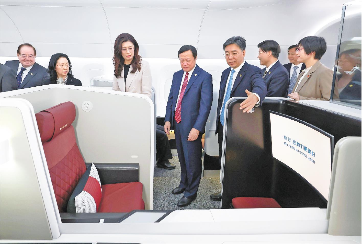 9日上午,郑丽文一行造访洋山港和中国商飞上海飞机设计研究院。风和日丽,海天辽阔,从繁忙的集装箱货运码头到国产商用飞机研发一线,科技赋能下的智能生产场景一派欣欣向荣,访问团看得仔细、听得认真。在接待单位邀请下,郑丽文还先后登上C909、C919、C929国产飞机展示样机的机舱内部,亲身感受大陆制造业的硬核实力。
