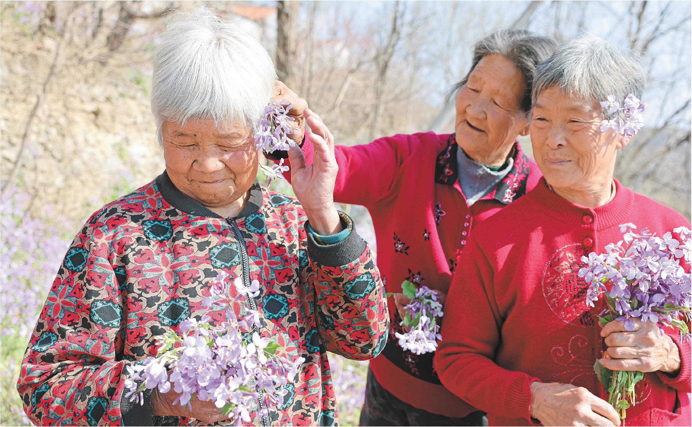 淹子岭村的“花”开啦!成片的二月兰像给山坡披上了紫色的绒毯。4月2日,老姐妹们漫步其间感受春光,78岁的李兴兰(中)为同龄的许长凤(左)戴上了花,三姐妹仿佛回到了十八岁。
