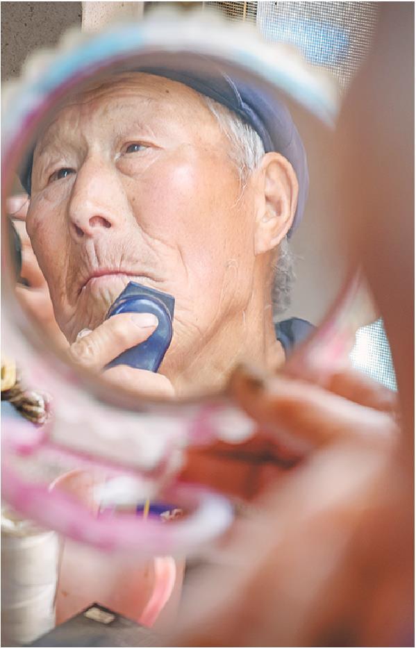 (右图)听到了村书记的广播,80岁的村民国洪民刮刮胡子,换身衣服,想要拍个精神的照片。