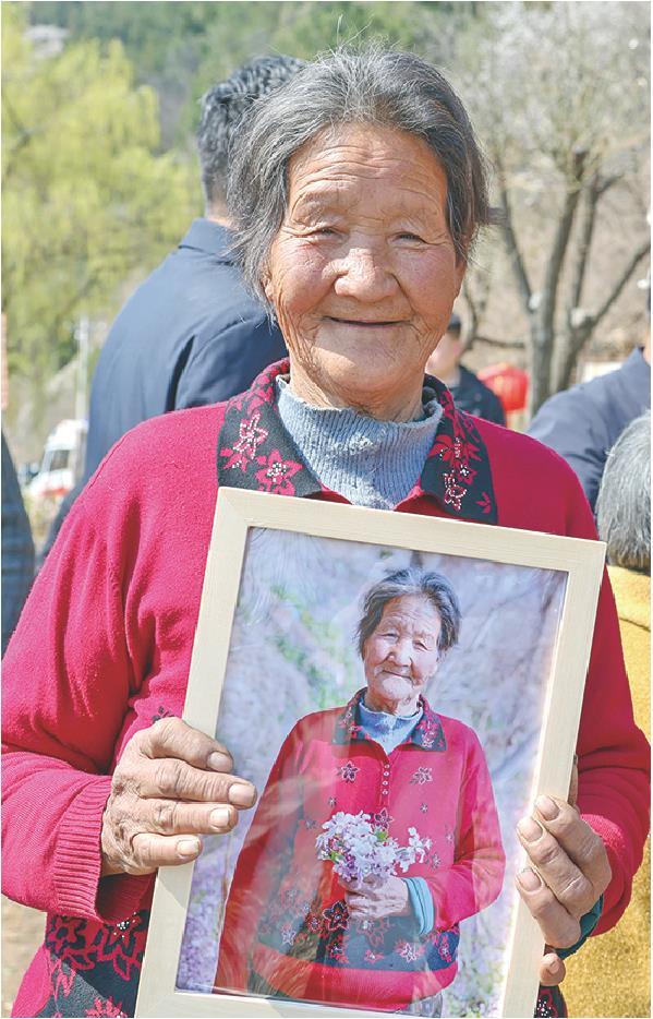 (左图)手捧鲜花的照片就是好看!78岁的村民李兴兰拿到自己的照片很开心,当天她特地穿上红毛衣,将自己打扮起来。