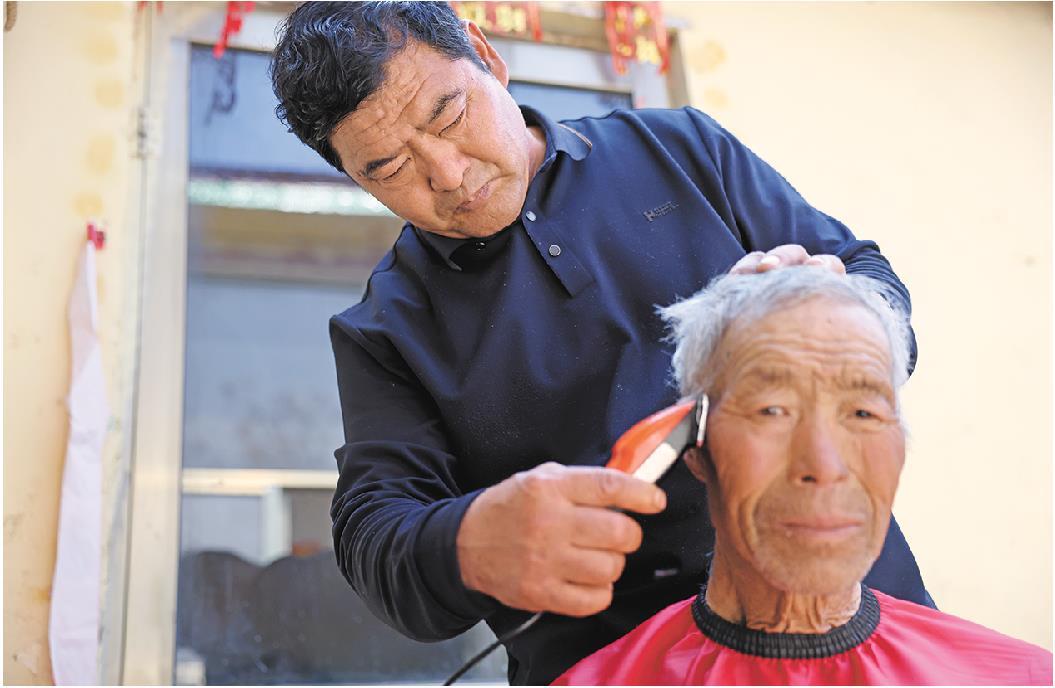 由于山高路远,淹子岭村党支部书记国成勤承包了为村里老人理发的活。