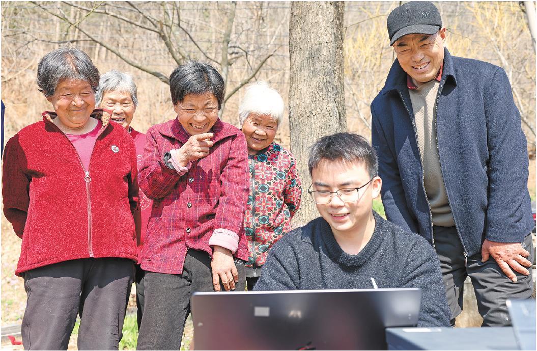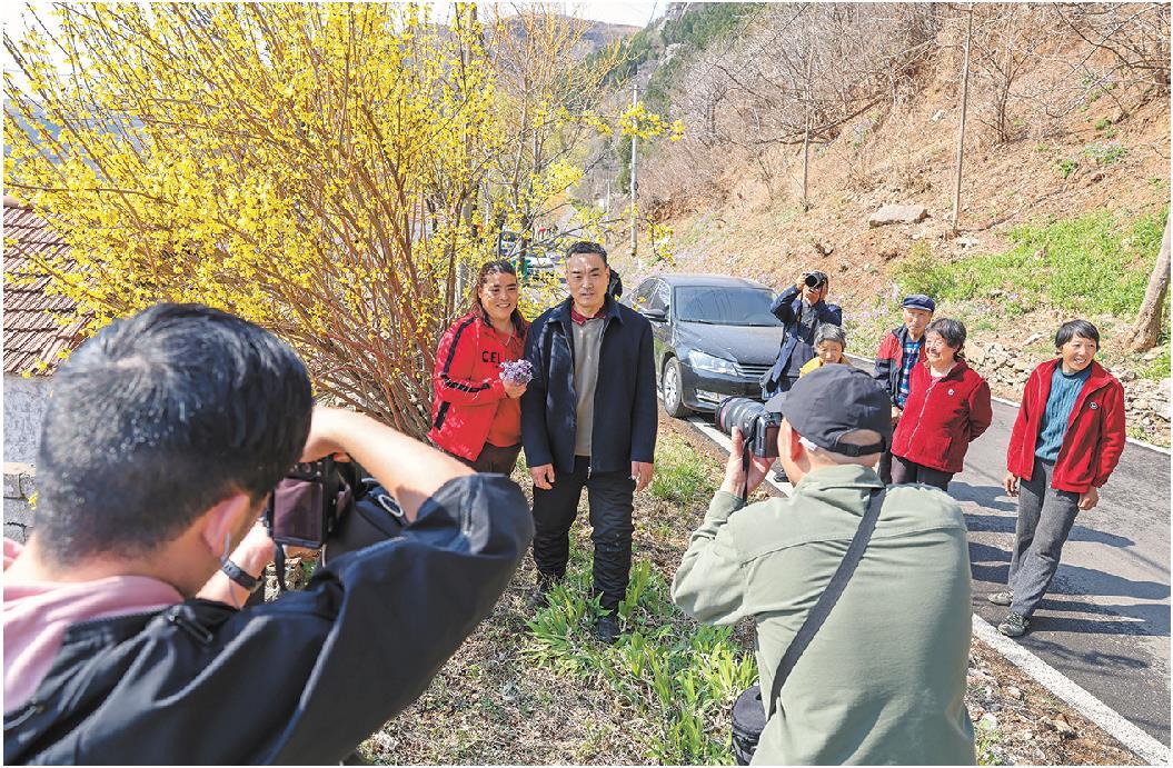 4月2日,在淹子岭村,村里房前屋后都是盛开的花,本报记者和公益摄影师为村里老人拍照。花开得正艳,拍照正当时!