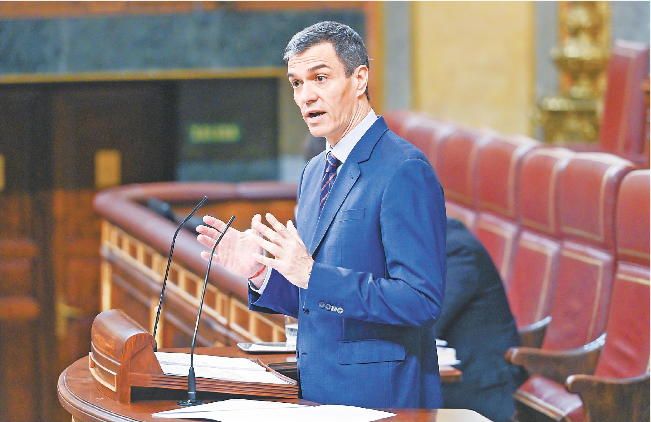 3月25日,西班牙首都马德里,西班牙首相桑切斯在众议院发表讲话,重申西班牙政府始终坚持反对中东战争的立场。