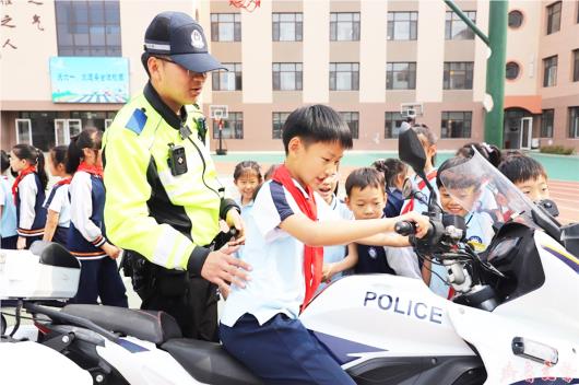 图为民警指导小学生模拟驾驶警用摩托车。