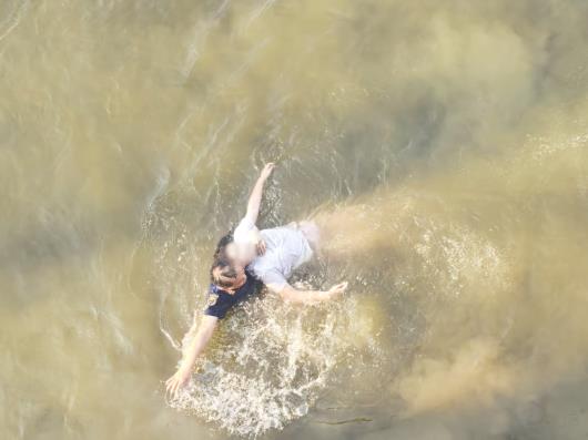 经过几次搜索后,那人终于找到了双眼紧闭已陷入昏迷的轻生女子,从背后托举着她,游向岸边,并迅速实施紧急救治。慢慢地,女子恢复意识,救人者全身湿漉漉地悄悄消失在人群中。