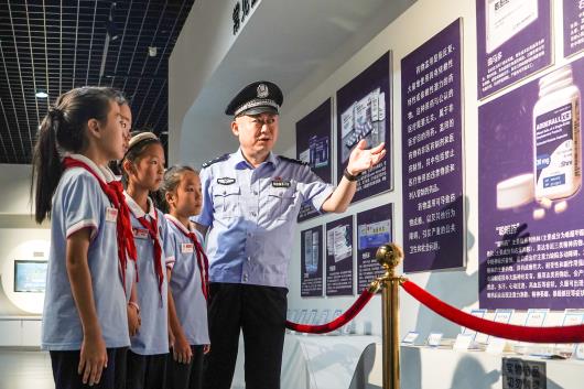 6月24日,在国际禁毒日来临之际,荣成市府新小学的部分学生代表,在民警的带领下走进荣成市禁毒预防教育展览馆,接受了一场“沉浸式”的禁毒宣传教育。 毕云飞 摄