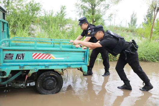 近日,高青县降雨导致有道路积水湿滑,特巡警大队队员在巡逻途中,看到一辆电动三轮车无法正常行驶,一位女士正尝试推动电动三轮车。队员立即上前查看情况,了解到宋女士驾驶电动三轮车回家,因涉水抛锚突然无法前行。队员让宋女士移步到安全地带后,快速上前用手推的方式,成功将电动三轮车从积水路段推至安全路段。