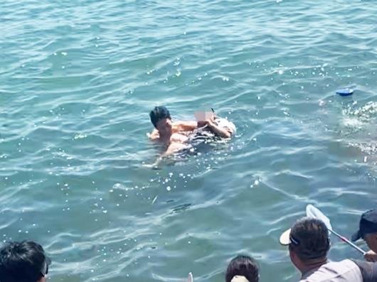 脚被锋利礁石划伤,他仍咬紧牙关托举男孩上岸