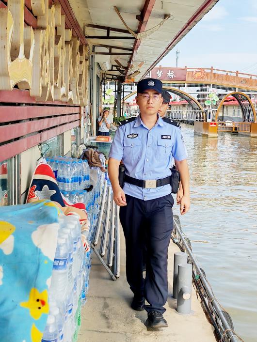 图①:民警乘船在水街巡逻。 图②:民警向