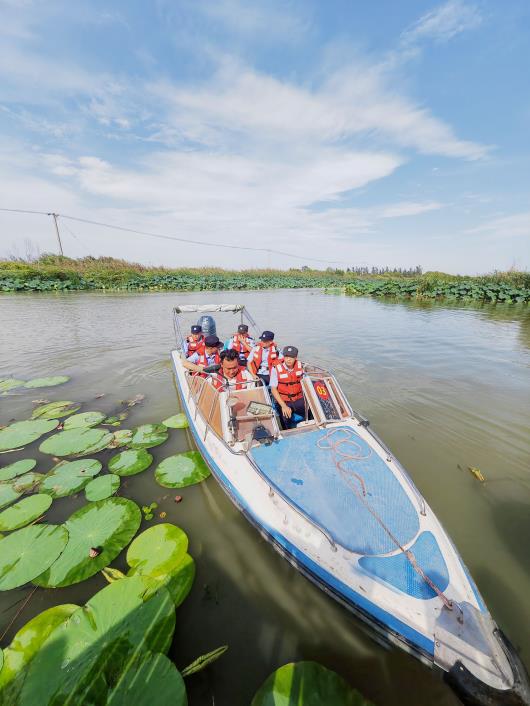 图①:民警乘船在水街巡逻。 图②:民警向