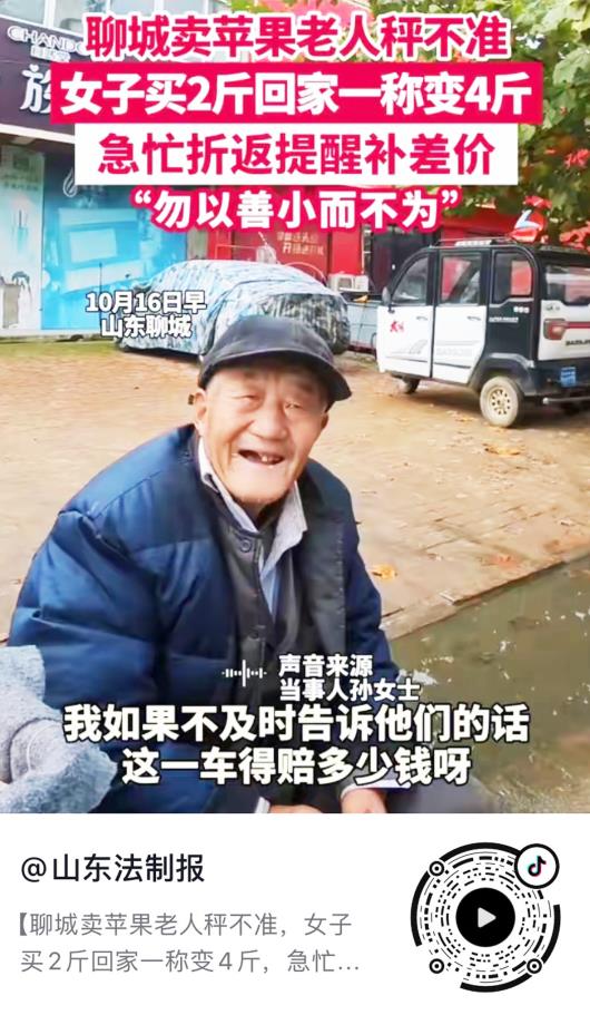 10月16日早上8点半,在聊城莘县魏庄镇,出门买菜的高女士顺手买了2斤苹果,提在手中感觉有点重,回家复秤发现苹果为4斤。于是她急忙返回苹果摊前,告诉老人:“你少收我钱了。”随后帮老人把秤调好,并补上了苹果差价。“如果我不及时告诉他们,这一车得赔多少钱呀。”高女士说,“勿以善小而不为。”