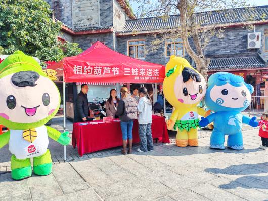 10月21日,第十七届江北水城·两河明珠(聊城)葫芦文化艺术节现场人头攒动。东昌府区司法局的普法吉祥物——“法小福”“法小禄”和“小水娃”也来到现场。普法宣传摊位前,活泼可爱的“普法三娃”和一本本图文并茂的《民法典》《防范电信网络诈骗》《以案释法》等宣传手册,吸引了不少游客驻足翻阅,为喜庆祥和的葫芦节,增添了一道生动又温暖的“法治新风景”。