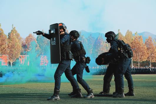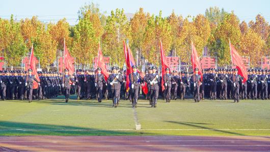 阅警仪式上,宣读了《关于授予2025级新生警察学员标志的决定》,组织了升国旗、迎警旗、分列式和新生宣誓仪式,2025级新生展示了警务化教育训练取得的阶段性成果,高年级学生进行了警务实战科目演练,汇报了实战技能教学训练成果。