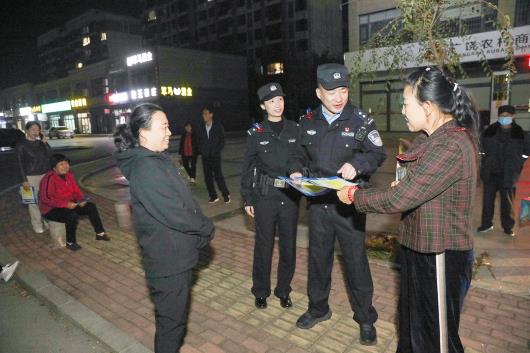 ▲东营市公安局农高区分局民警在夜间巡逻中,开展反诈宣传。 解朋龙 摄
