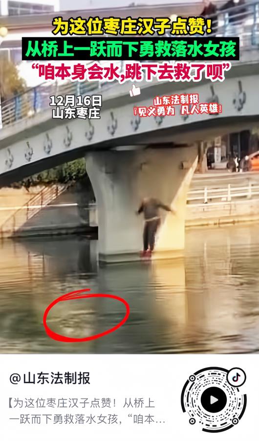 12月16日下午,枣庄市台儿庄区一名女孩不慎从桥上落水。正在桥上遛弯儿的刘登元发现险情后,果断从桥上一跃而下,跳入冰冷的河水中,拼力将落水女孩救上岸。事后,刘登元在接受本报记者采访时表示:“咱本身会水,跳下去救了呗。”