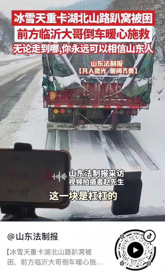 1月20日,湖北十堰,赵先生驾驶重卡拉货途中,因路面积雪结冰被困山路。前方同样驾驶重卡的临沂司机王先生发现后主动伸出援手,最终成功将赵先生的车拖离困境。网友评论:“无论走到哪,你永远可以相信山东人。”