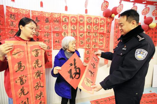 1月28日,济南市公安局市中分局七贤派出所携手文贤社区开展新春送福活动,特邀专业文艺工作者现场挥毫泼墨,为居民书写大红春联和福字,一幅幅饱含年味与祝福的作品,让居民们喜笑颜开、满载而归。活动现场,民警结合春节期间安全防范特点,用通俗易懂的语言讲解反诈、防火、防盗等安全知识,提醒大家提高安全防范意识。此次活动既传递了新春的温暖与祝福,又筑牢了社区安全防线,切实保障辖区群众度过一个平安祥和的春节。 郝鑫城 摄