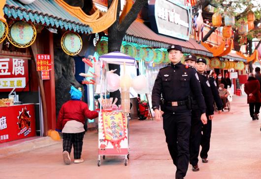 近日,在济南市济阳区“九曲黄河万里情”街区,济阳公安民警开展日常治安巡逻,加密重点区域巡查,提供便民服务,守护市民游客出行安全。