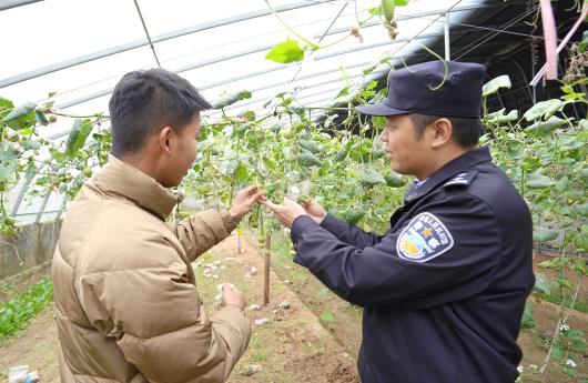 左图:冠县公安局贾镇派出所民警深入大棚开展安全防范宣传。 邢先进 摄
