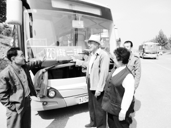 近日,泰安市公交公司新开通了K26路公交车深受附近老百姓的欢迎。这条新线路起点是从泰山火车站至天颐湖旅游度假区,终点在满庄镇北留小区,新线路开通后既有利于城里市民到天颐湖旅游度假,又有利于附近老百姓进城,彼此便利,他们露出了喜悦的笑脸。上图为村民喜迎新公交车的到来。